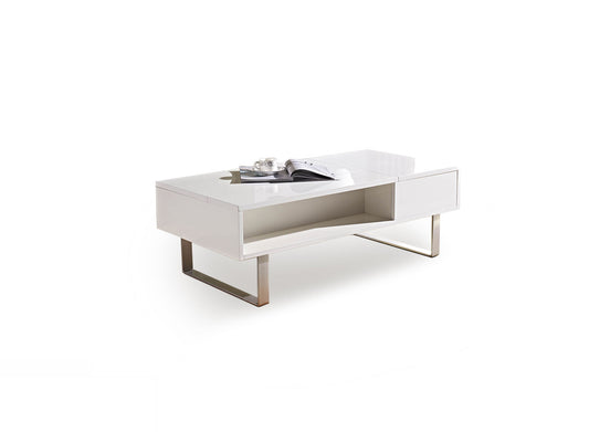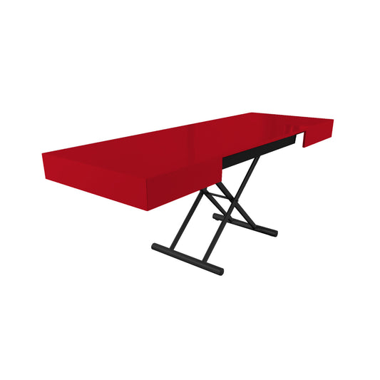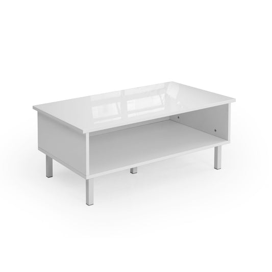 Cadence comes in regular and a mini size and is our best selling lift top coffee table with storage underneath. The sleek and durable glass sides and either a wood or white glossy finished top lets you relax on the couch at coffee table height, then lifts to desk and table height so you can work or eat.