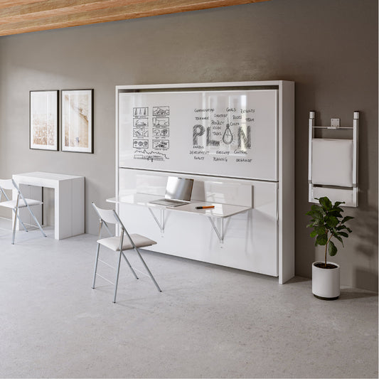 Our Amore Murphy is a perfect style for multi-functional rooms. It’s a modern and sleek foldable bunk bed with a desk for working that can also be a table for eating or folding laundry. The two beds fold down horizontally and you have the flexibility of keeping the desk and table for a workspace below while only lowering the top bunk making it the ultimate in multi-purpose space maximization.