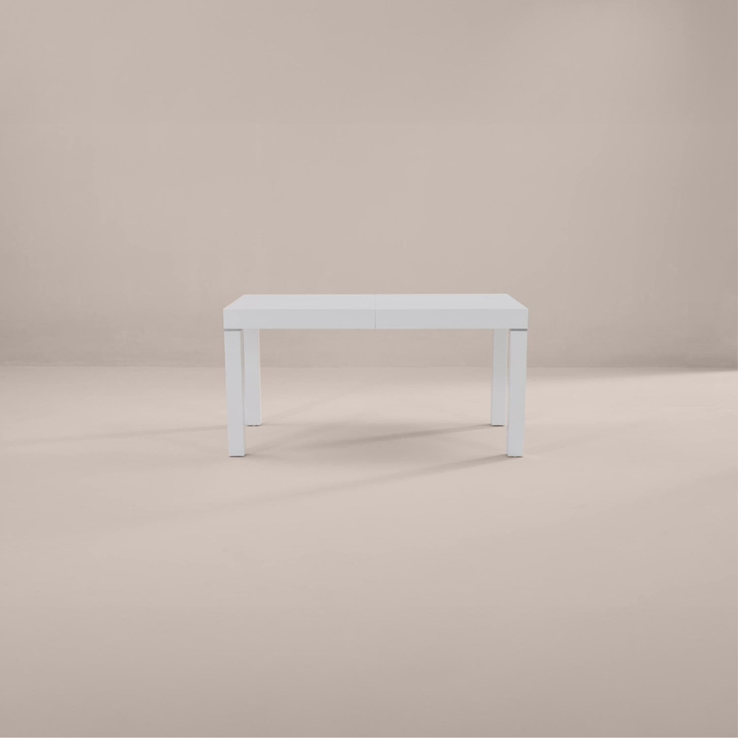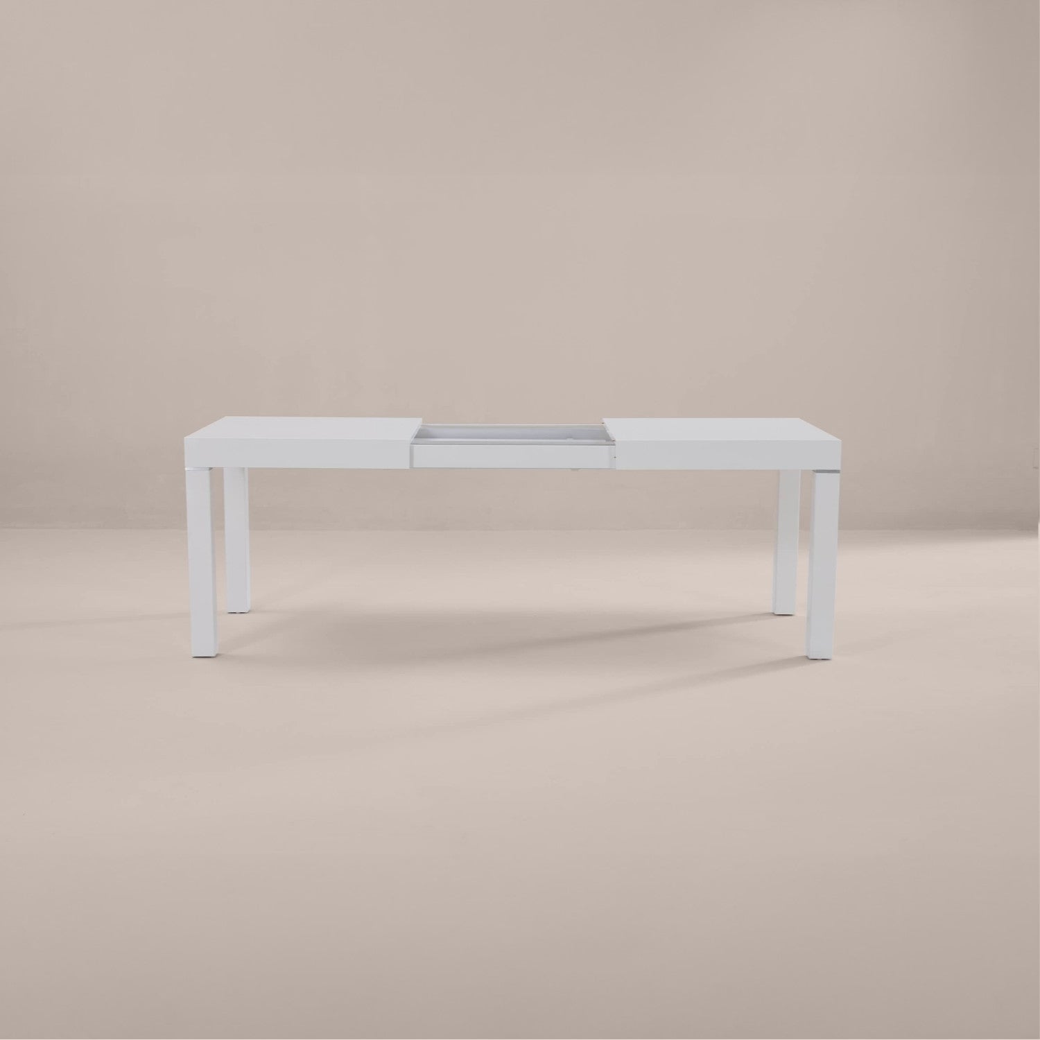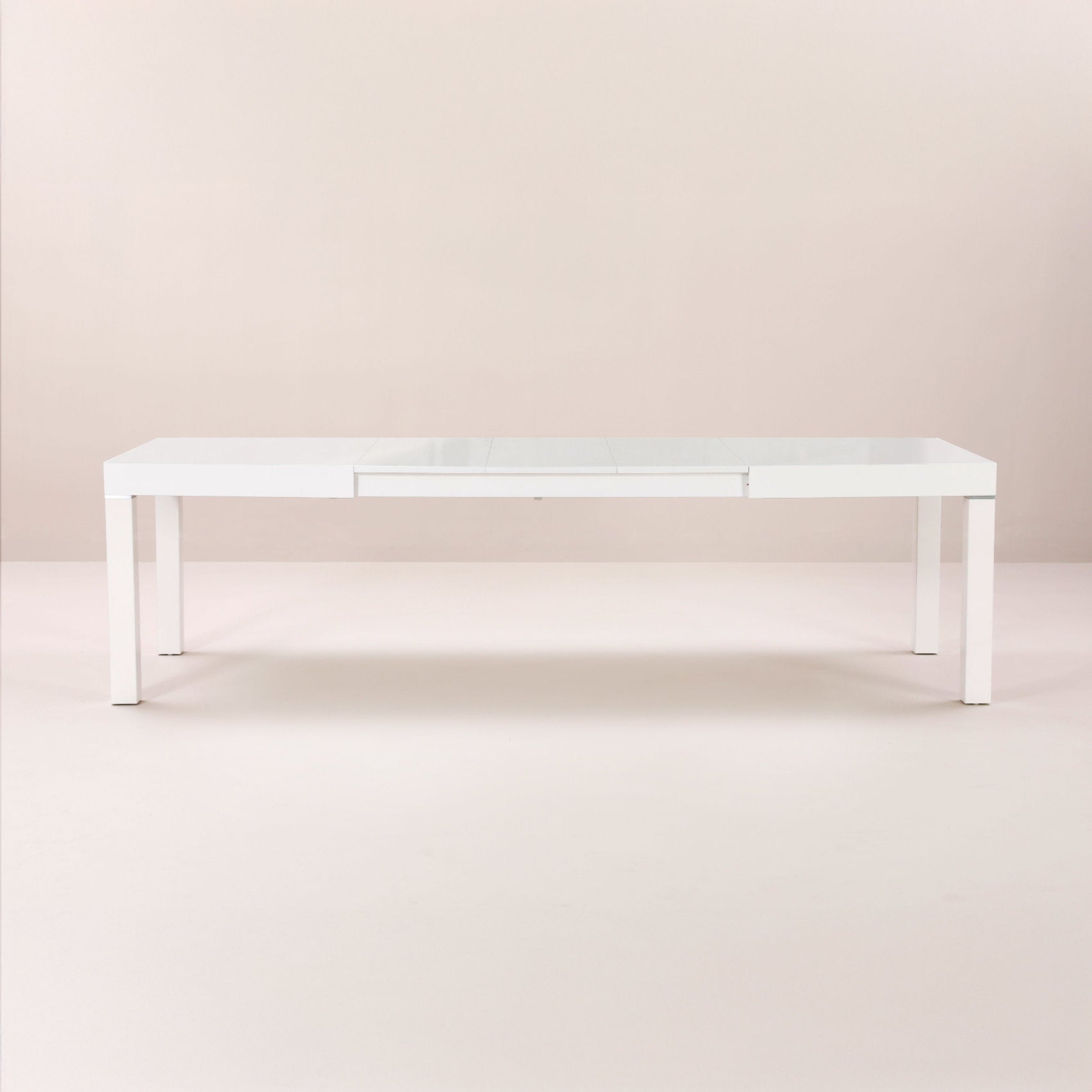 The Pillar Dining Table that extends to seat 12 people comfortably for a party or can rest compacted as a cozy 6 setting. The contemporary lines of the dining table, paired with the shiny gloss finish, create a centerpiece table that is striking yet subtle. A chic design inset of brushed metal on the corners where the legs and table top join, make a formal statement. The table offers great flexibility because it can be used at so many different lengths.