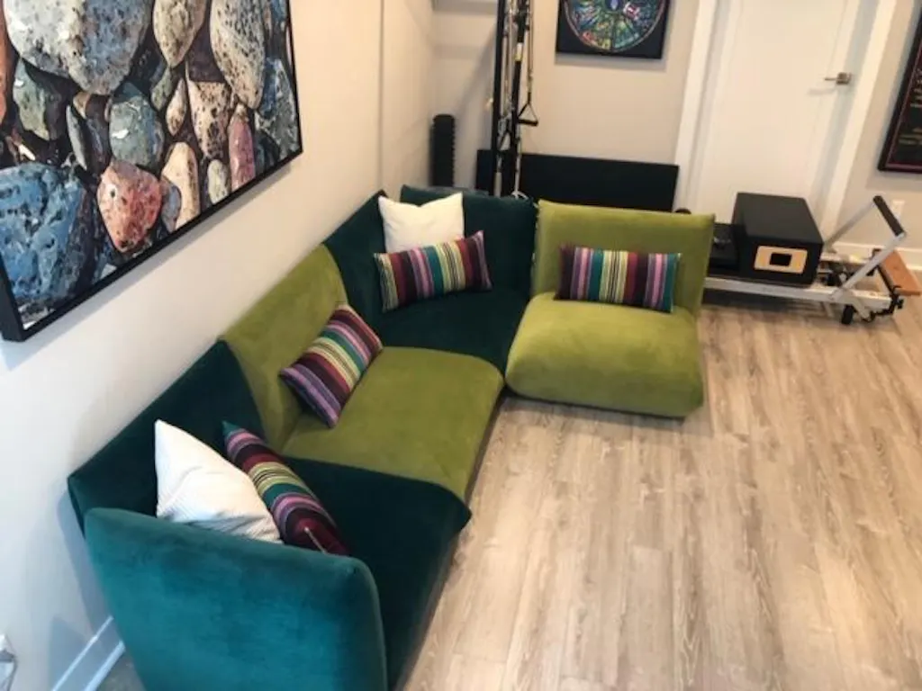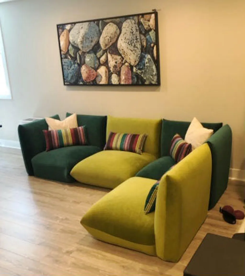 The idea is to put you in charge of your configuration. Mix and match the pieces that are designed to inspire you and your living room or even in a bedroom you could break up the set and have it function as a chaise. The fabric has a microfiber velvety feel and cleans phenomenally well if it is dirtied in any way. The scrumptious looking striped pillows and ottoman are great additions to the armless pieces in apple green and to the emerald colored corner pieces.