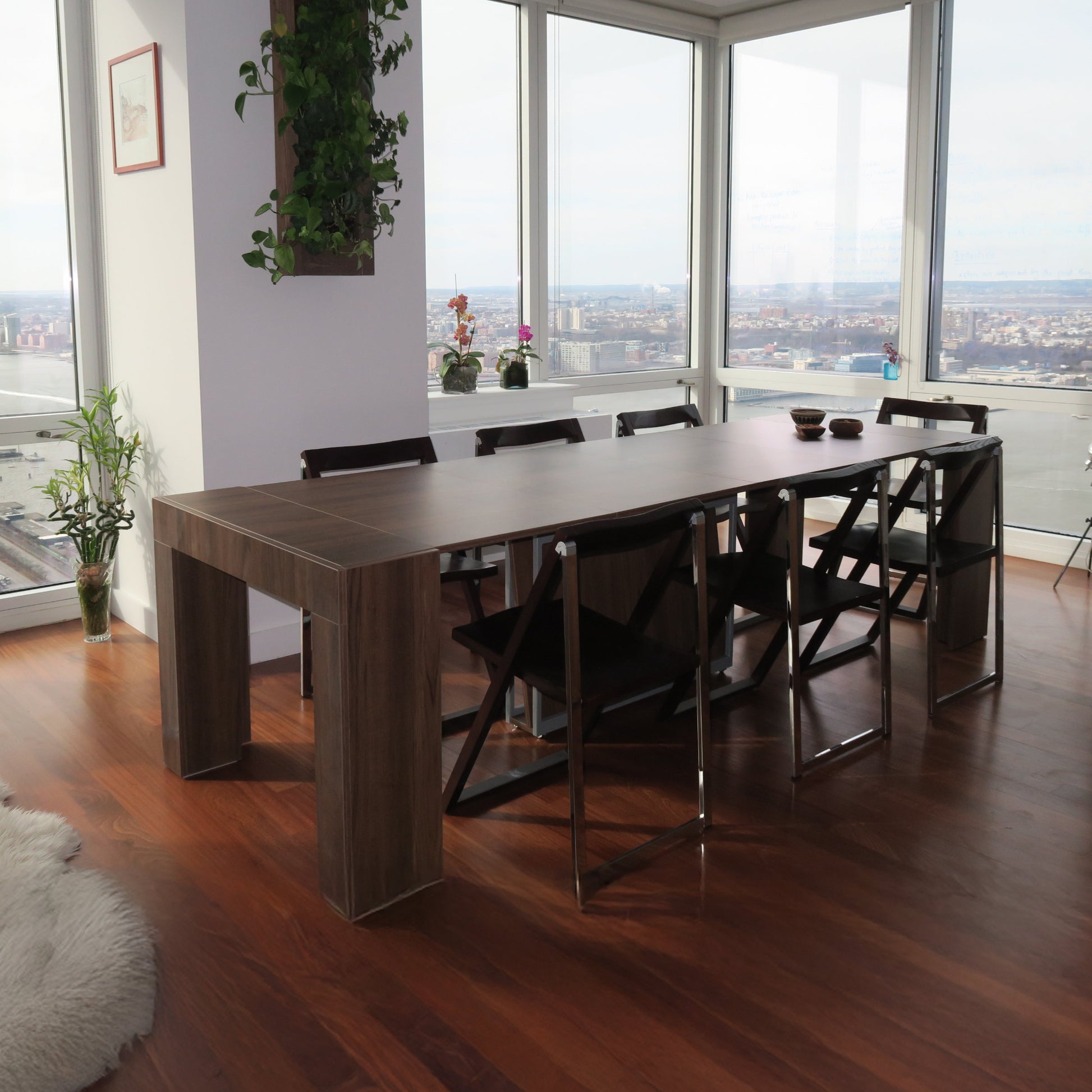 Seat 12 people comfortably and even squeeze in more for a big gathering. One of the largest and the most convenient transforming dinner tables on the market. It has features other tables don't, like extension locks, self storage, dual console locks, rotating support base and panel matches across 5+ extensions so the grains connect. As a small console size this measures at 19.69" deep by 36.22" wide, perfectly sized for modern apartments but expandable to over 10.5 feet in length. The table has wheels as well as fabric sliders underneath the legs so they easily glide while protecting your floors. Extensions snap together with dowels but can optionally be locked together with a twist.