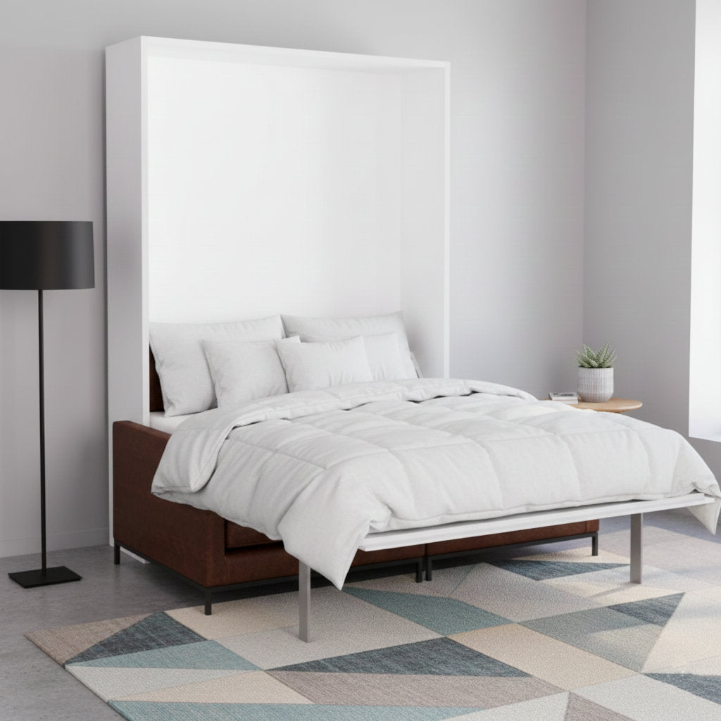 The MurphySofa wall bed design levers over the leather sofa and you now have a bedroom for everyday use or for out of town guests. Modular design gives you room to modify your future leather sofa options and look of your living room or bedroom. Manufactured in Europe to ensure exceptional quality and built to fit USA sized mattress (10 inches or less) and sheets. Available in exterior Glossy White and Matte White panels.