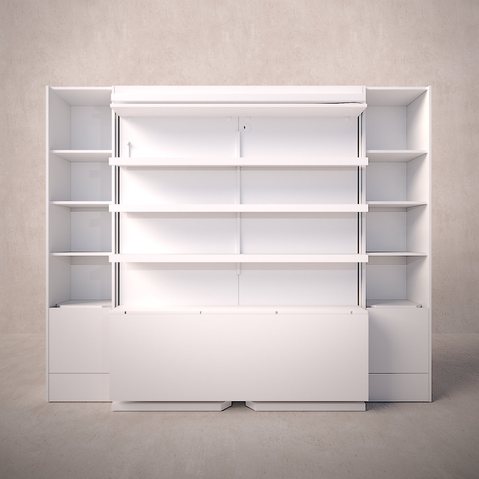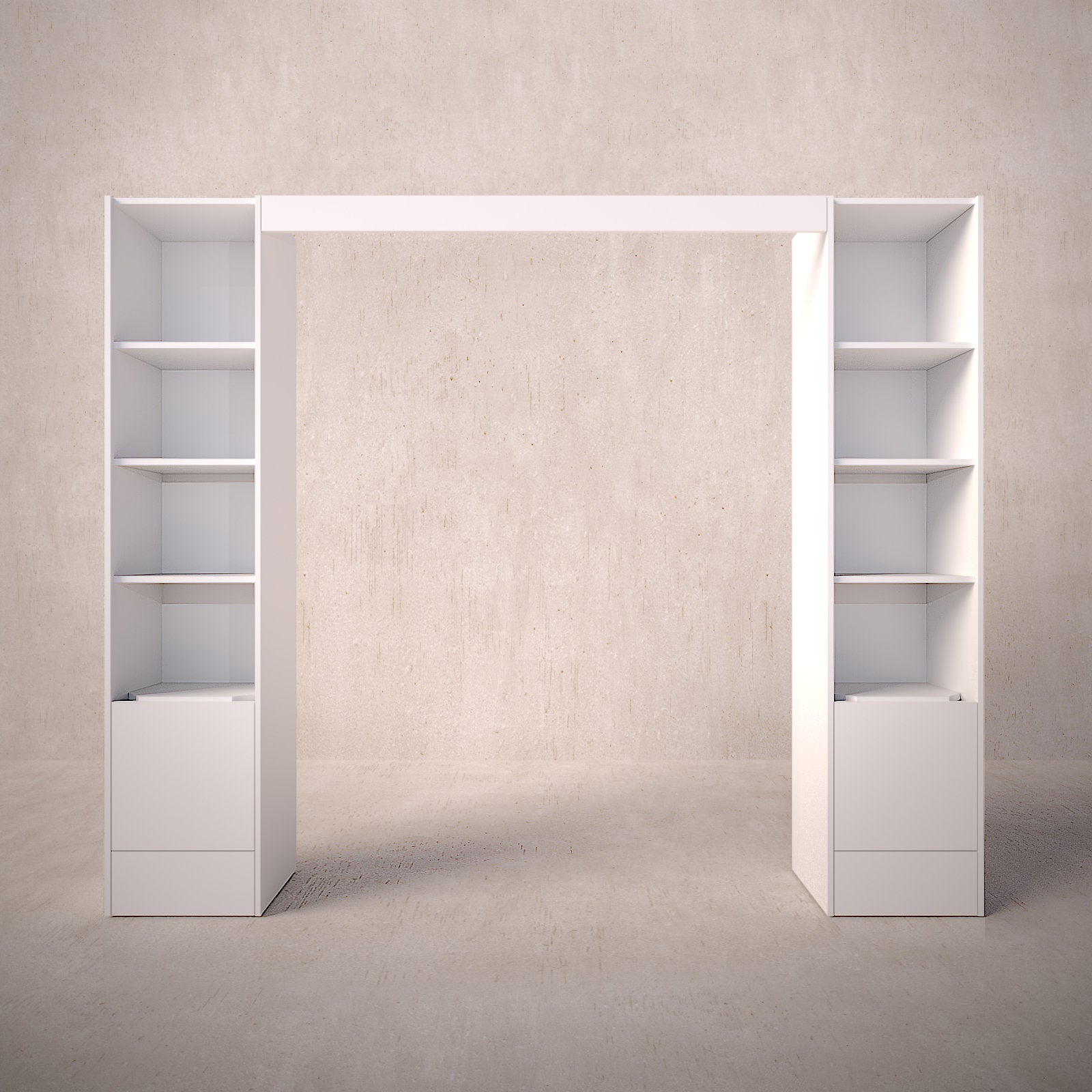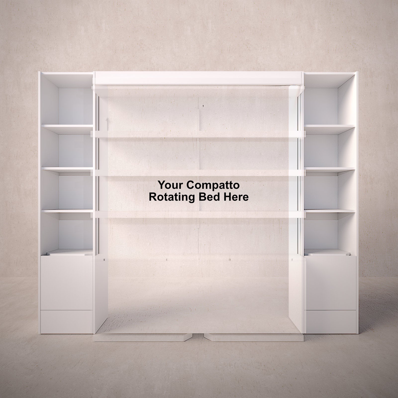 This is a compatibility kit (Includes 2x Cupboards + 1 topper panel) that makes your Compatto Rotating Murphy bed match the panel cupboards in height with a top bridge panel that joins the flanking cupboards. Once set up you can add more Panel Modular Cupboards as they stack side by side to give you vast amounts of storage. On installation you have the choice of setting the back panel as the wood finish or the panel matched finish, it simply reverses. The top and middle panels are optionally installed so you can get creative with your designs and leave it partially open, all open, or all closed and mix up the styling with your other modular cupboards.