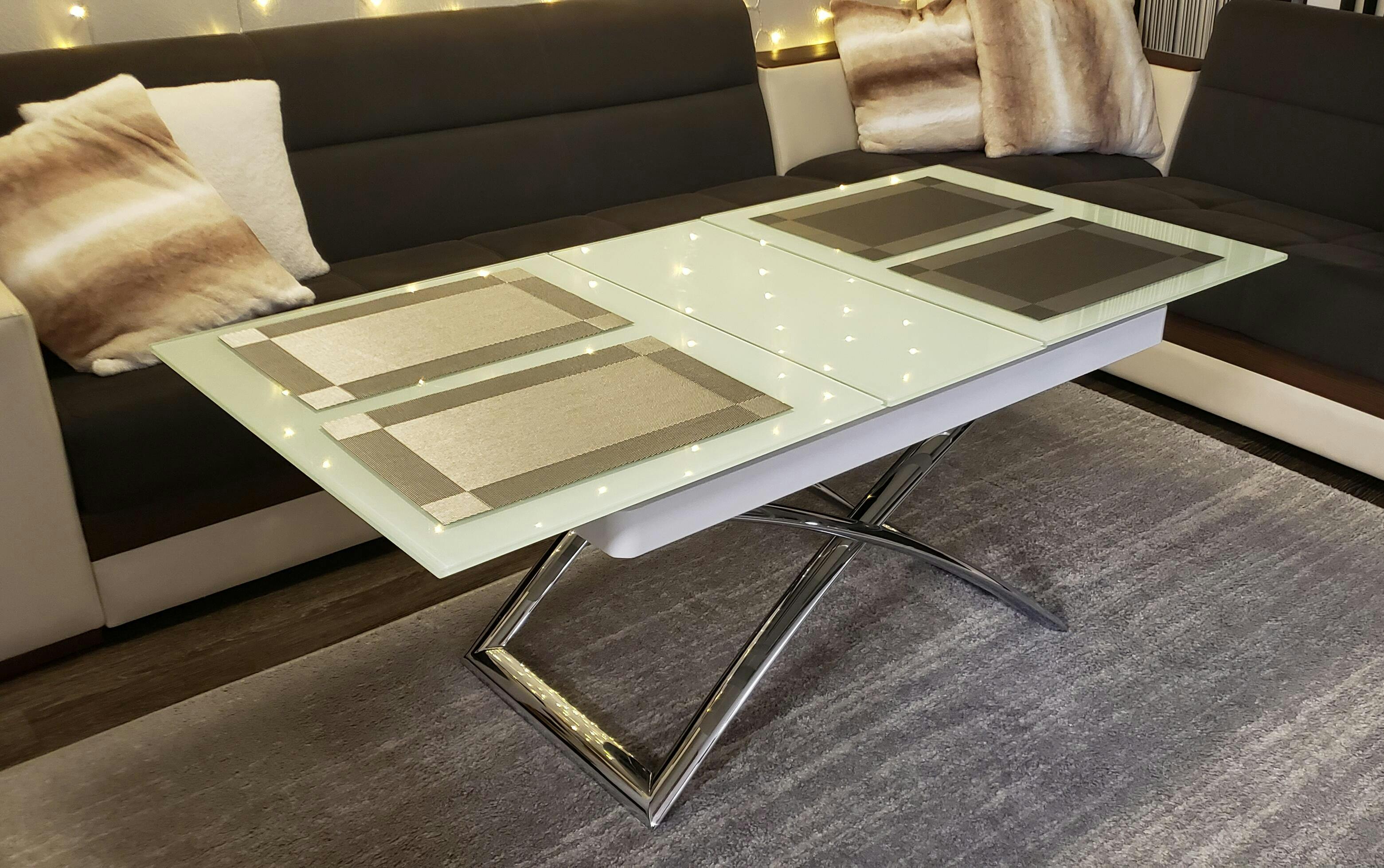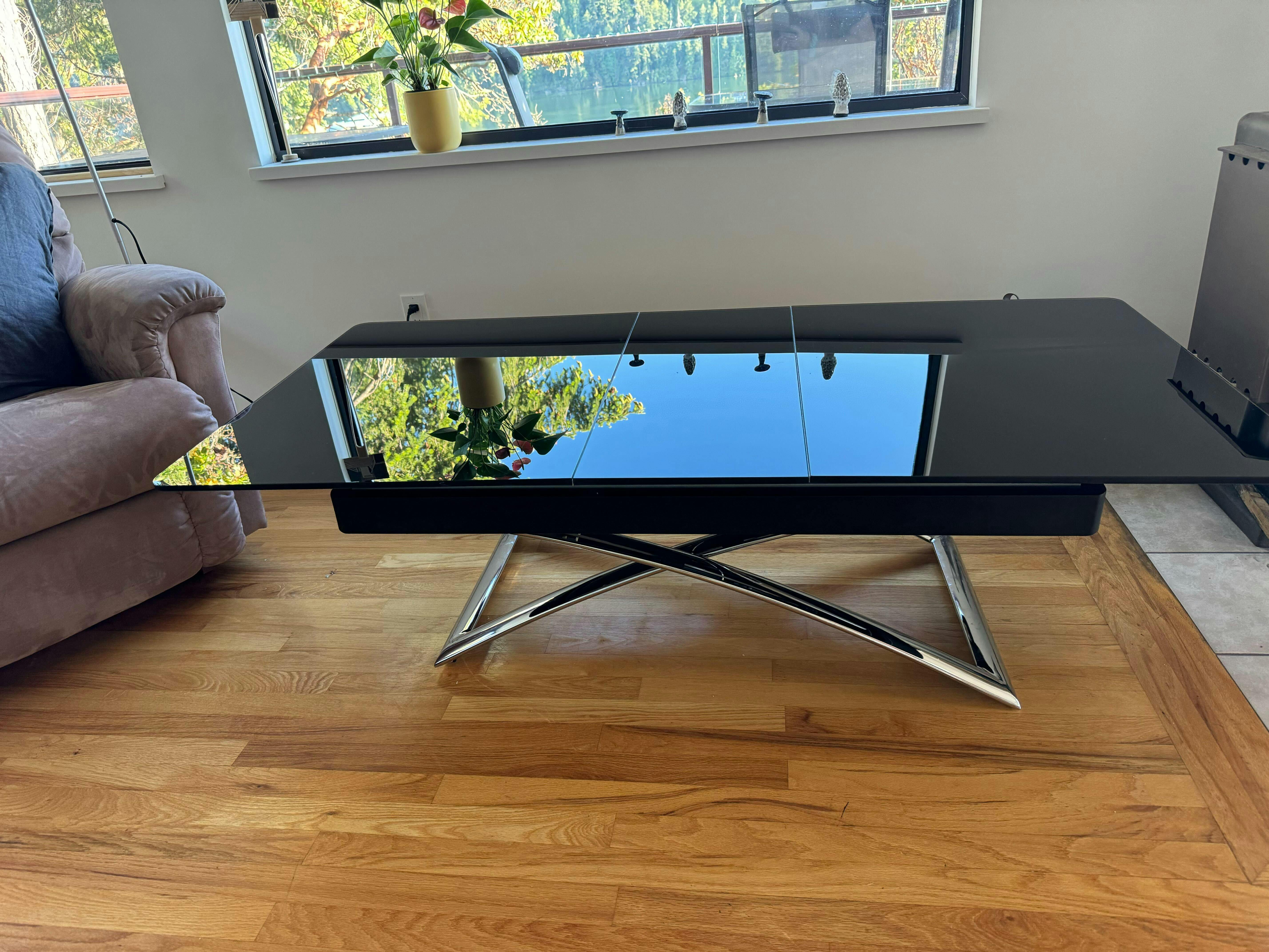 Stunning modern table, with sleek curved chrome legs and beautiful glass finish. As a coffee table on its own it is a fantastic centerpiece with an added bonus of being able to expand out to a larger size in order to accommodate guests or family dinners. Lever hydraulic mechanism enables lifting or lowering the table. The Obsidian table can extend out with a hidden leaf for a larger table area. Click on the video tab below to view a demonstration. Don't forget to check out our Expand wooden lifting coffee table for more living room options! Or add on 8 Nano chairs to make an Obsidian dining set.
