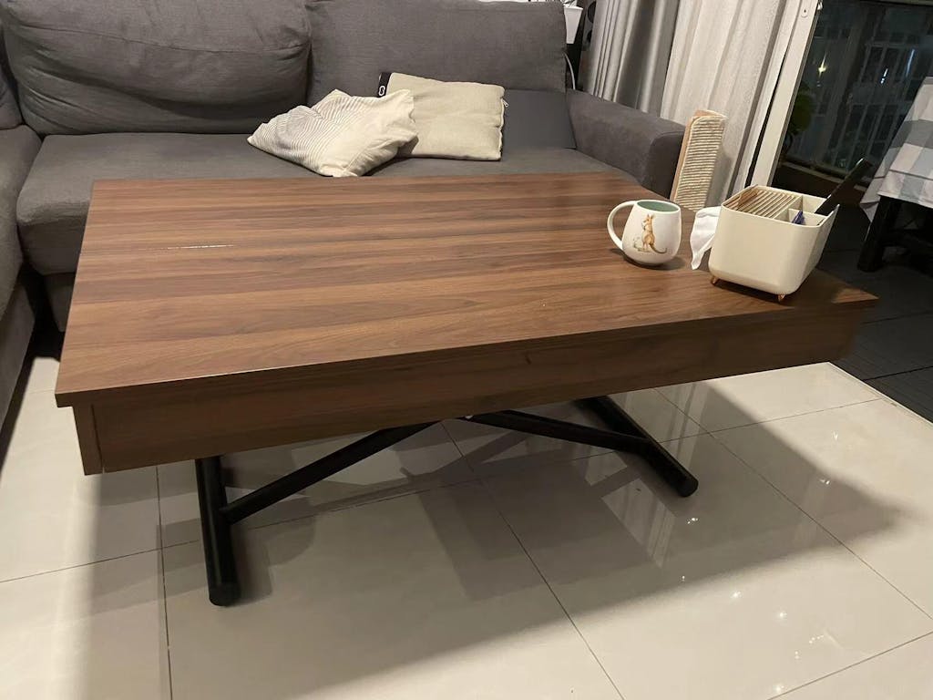 Hydraulic Gas Piston activated by a pull lever. Simply pull the lever to adjust the table to any height of your choosing between the lowest and table height. Let go of the lever and it will stay locked in place and support well over 200 lbs of food and weights. (we strongly do not recommend standing on this table, despite its strength). The table can be lowered or raised in coffee size or full dining size.